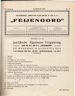 Prominent aanwezig de agenda voor de ALV die op maandag 18 augustus 1924 in de bovenzaal Café Restaurant “De Spil” aan de Dordtschestraatweg, met opvallend een agenda punt ‘Voorstel tot aanstelling van een gesalariëerd beamte te benoemen door het Bestuur’. Lees verder
